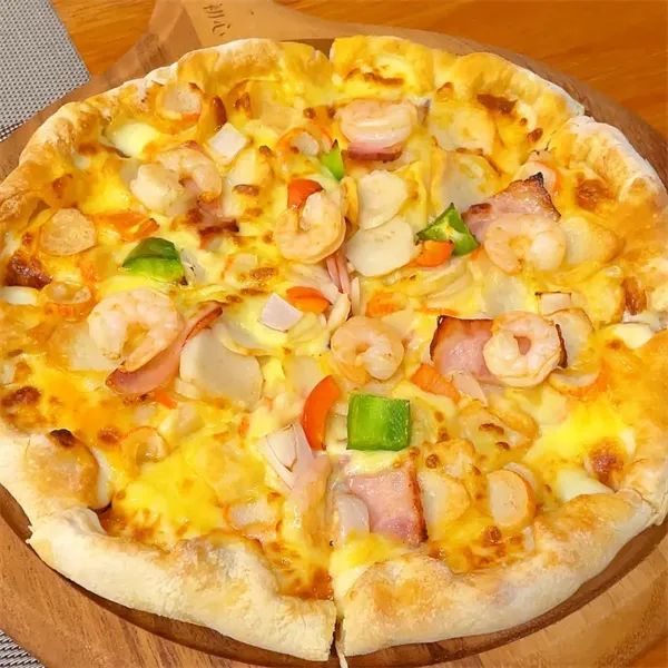 現烤披薩芝香濃郁,融化的芝士可以拉出長(cháng)長(cháng)的絲,搭配點(diǎn)綴在上的海鮮,也是別有一番滋味在其間,絕對值得等待。