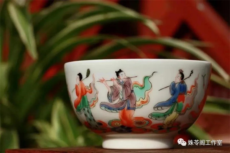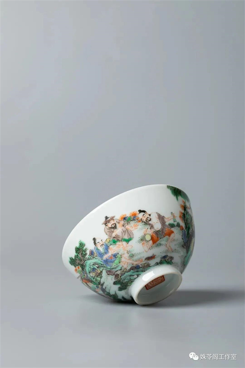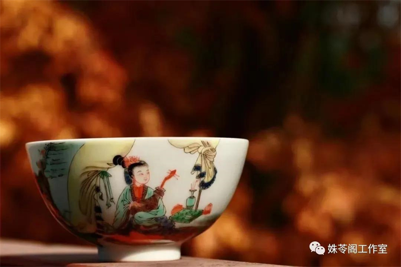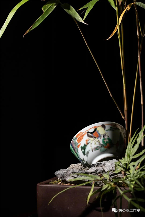 我把一只主人杯拿在手里細細琢磨。一張馬蹄足大案,一只綠釉大花瓶,案子邊一個(gè)孩童撲向一位身著(zhù)綠衣裳的女士。再兩步遠的距離,另一位女士搖扇愜意地看著(zhù)這個(gè)場(chǎng)景。她是看客,我們也是。在這個(gè)畫(huà)面中,礬紅、正綠、雪白、古黃……擺脫大紅大紫的艷俗,這些色彩填充出一股如古畫(huà)般的雅意。
