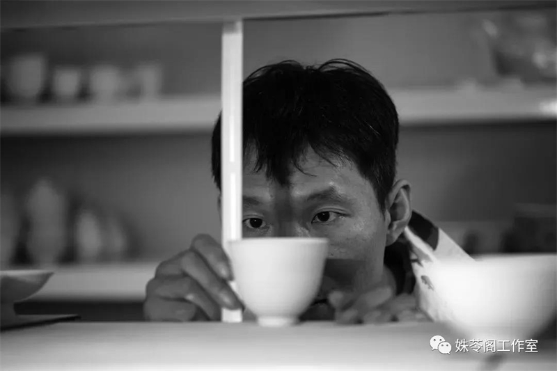 我從鏡頭里看見(jiàn)了劉陽(yáng)陽(yáng),他瘦削的臉保持在瓷胎十公分遠的距離,眼睛微瞇,捏著(zhù)筆的手從左到右小范圍拖動(dòng)。幾分鐘后,他轉動(dòng)杯子,頭牽動(dòng)頸部微微抬了一下。