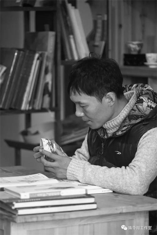 這是古彩的性格,也是劉陽(yáng)陽(yáng)的性格。他話(huà)不多,幾乎的時(shí)間都在作坊里,早上七點(diǎn)半到作坊,凌晨?jì)牲c(diǎn)離開(kāi)。長(cháng)時(shí)間的案上工作讓他看起來(lái)脖子微微前傾。從作坊里的一個(gè)學(xué)徒,到畫(huà)師再到獨立成為一個(gè)窯主,他的初心都沒(méi)有變過(guò)——能吃飽飯,有睡覺(jué)和做瓷器的地方就可以了。