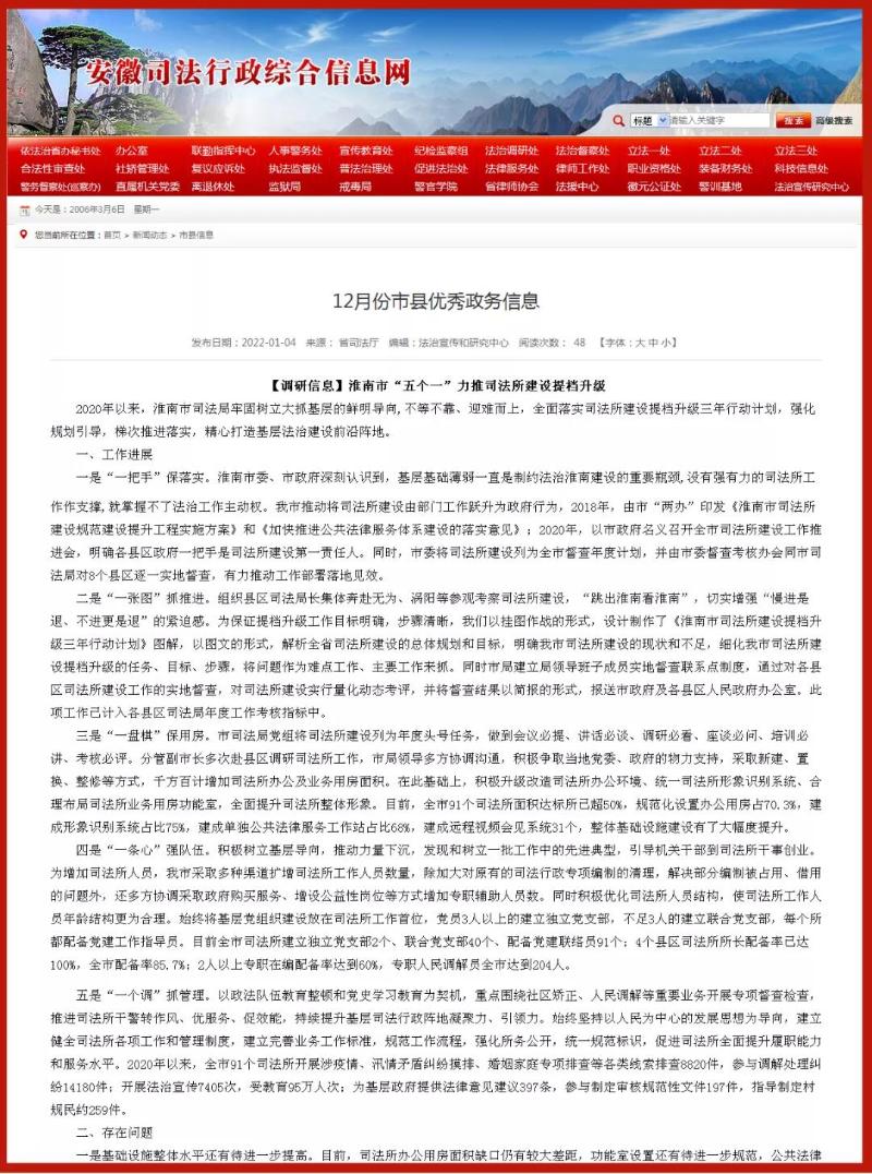日前,安徽司法行政綜合信息網(wǎng)公布“12月份市縣優(yōu)秀政務(wù)信息”:【調研信息】《淮南市“五個(gè)一”力推司法所建設提檔升級 》一文榮登榜首!