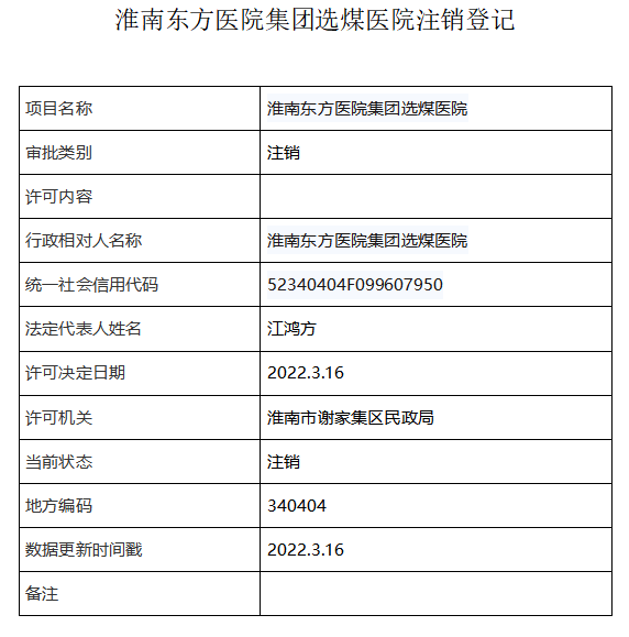 淮南東方醫院集團選煤醫院注銷(xiāo)登記
