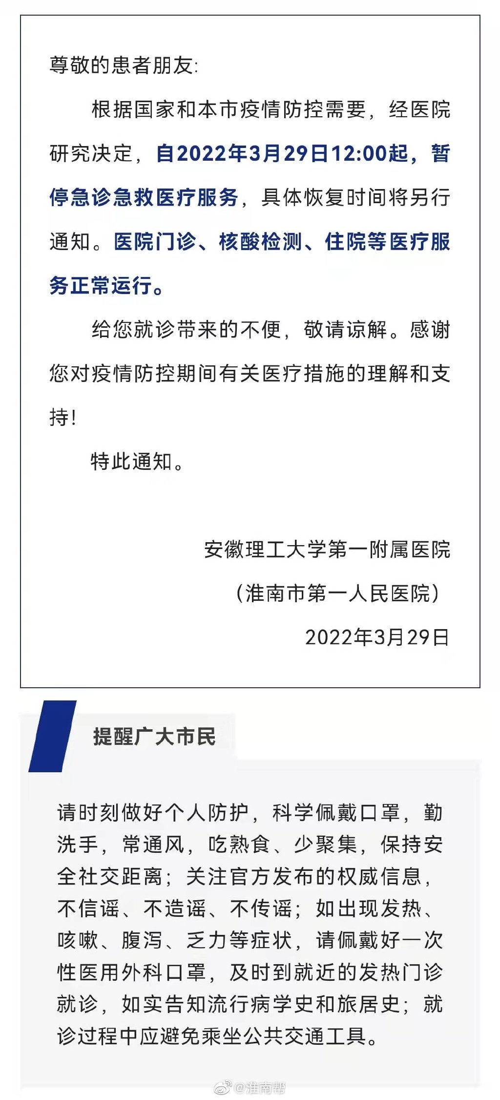 根據國家和本市疫情防控需要,經(jīng)醫院研究決定,自2022年3月29日12:00起,暫停急診急救醫療服務(wù),具體恢復時(shí)間將另行通知。醫院門(mén)診、核酸檢測、住院等醫療服務(wù)正常運行。