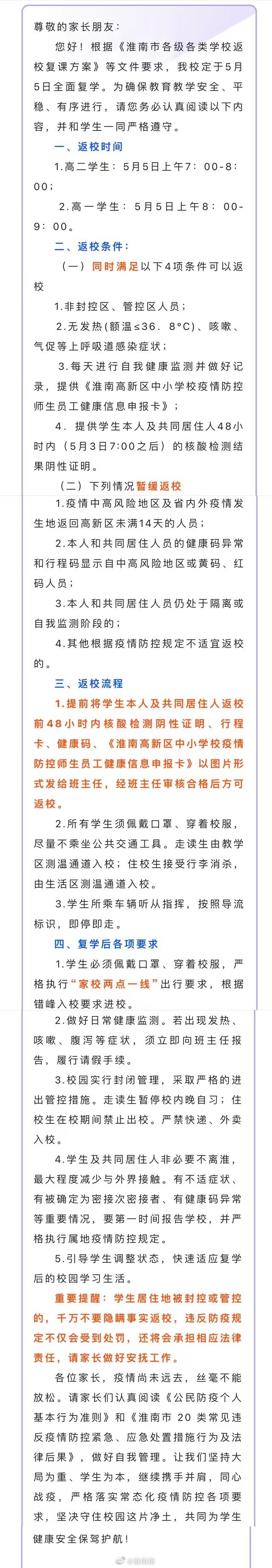 淮南二中關(guān)于全面復學(xué)致家長(cháng)的一封信