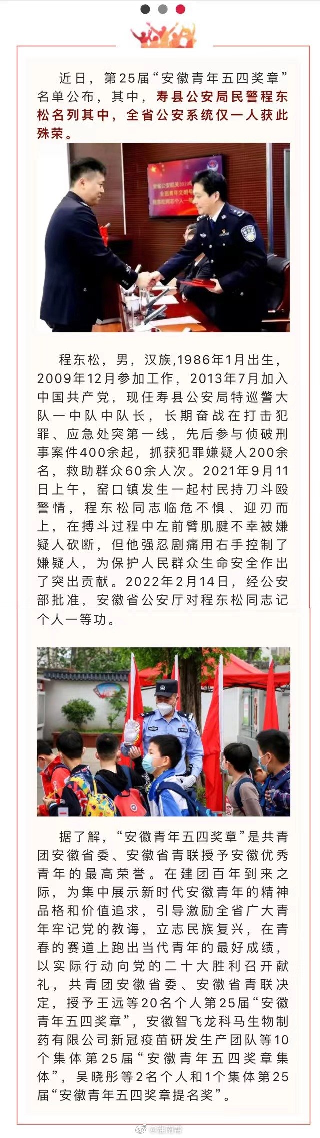 近日,第25屆“安徽青年五四獎?wù)隆泵麊喂?,其中,壽縣公安局民警程東松名列其中,全省公安系統僅一人獲此殊榮。