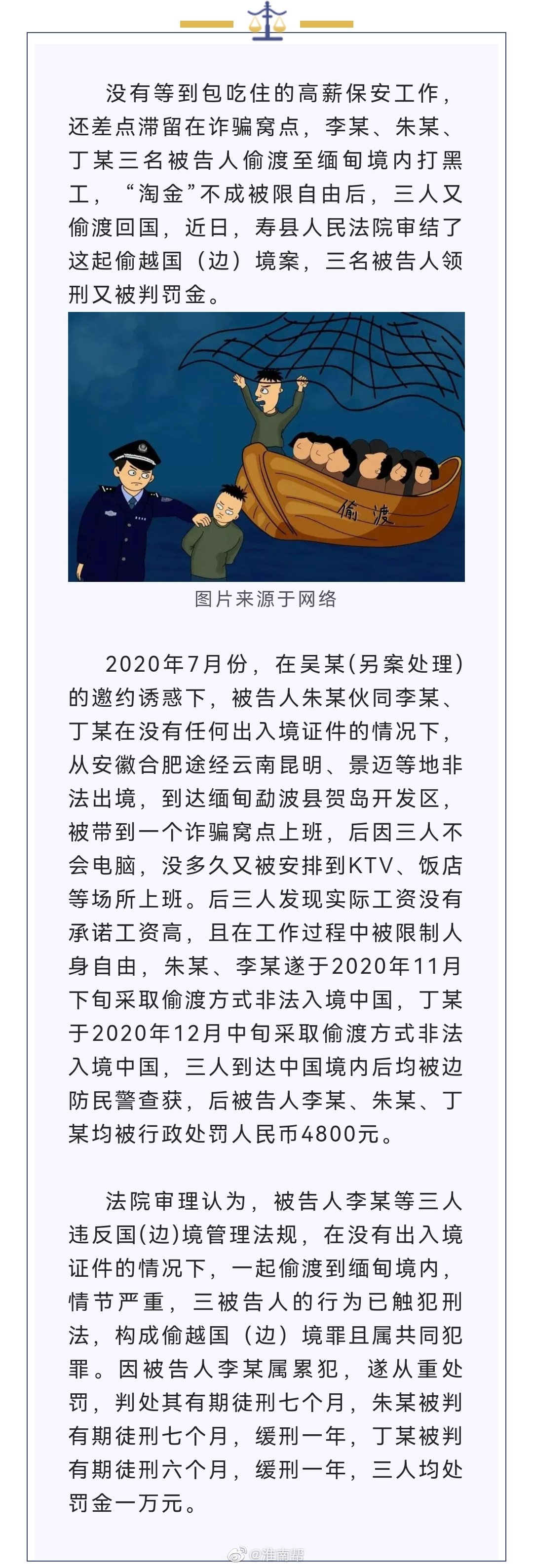 淮南壽縣三男子偷渡緬甸“淘金”被限自由,潛回國內獲刑受罰!沒(méi)有等到包吃住的高薪保安工作,還差點(diǎn)滯留在詐騙窩點(diǎn),李某、朱某、丁某三名被告人偷渡至緬甸境內打黑工, “淘金”不成被限自由后,三人又偷渡回國,近日,壽縣人民法院審結了這起偷越國(邊)境案,三名被告人領(lǐng)刑又被判罰金。