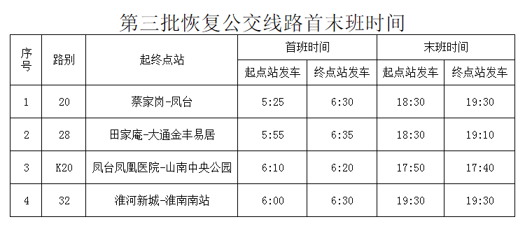 為保障淮南市復工復產(chǎn)復學(xué),經(jīng)上級批準,淮南公交再行恢復部分公交線(xiàn)路運營(yíng),現將有關(guān)事項通告如下: