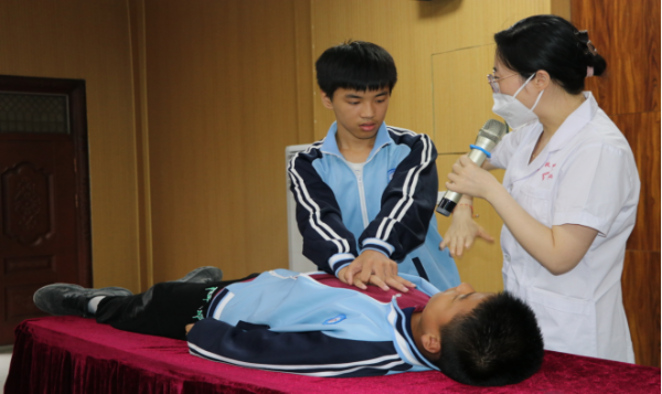 活動(dòng)現場(chǎng),胡葉蘭護士長(cháng)通過(guò)幽默風(fēng)趣的語(yǔ)言和鮮活生動(dòng)的案例,為同學(xué)們科普了新冠疫情的預防,心肺復蘇,海姆立克急救法,并為同學(xué)們做了現場(chǎng)演示。