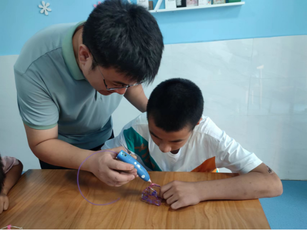 “哇!真的把小桌子打印出來(lái)了!”特校的孩子們首先來(lái)到3D打印科普體驗活動(dòng)現場(chǎng),一雙雙好奇的眼睛目不轉睛地看著(zhù)小桌子是如何被打印出來(lái)的,大家驚奇開(kāi)心的樣子溢于言表。隨后,學(xué)生在活動(dòng)老師的指導下,一步步的接線(xiàn)、預熱、勾勒圖形,體驗著(zhù)“妙筆生花”的別樣趣味。