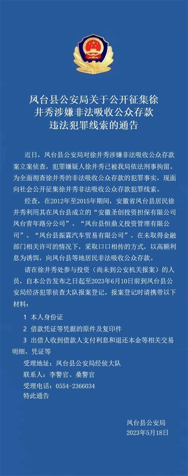 鳳臺縣公安局關(guān)于公開(kāi)征集徐井秀涉嫌非法吸收公眾存款違法犯罪線(xiàn)索的通告