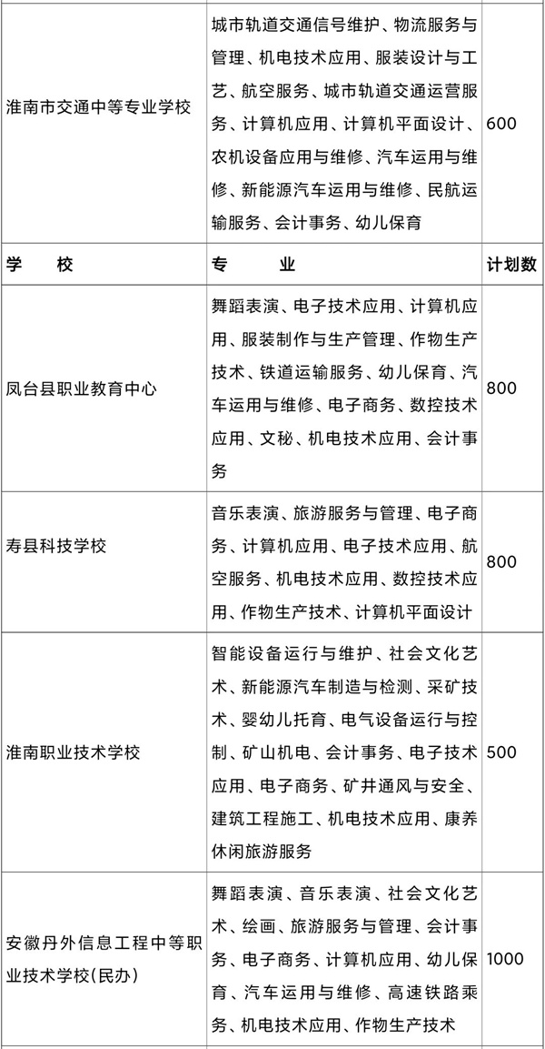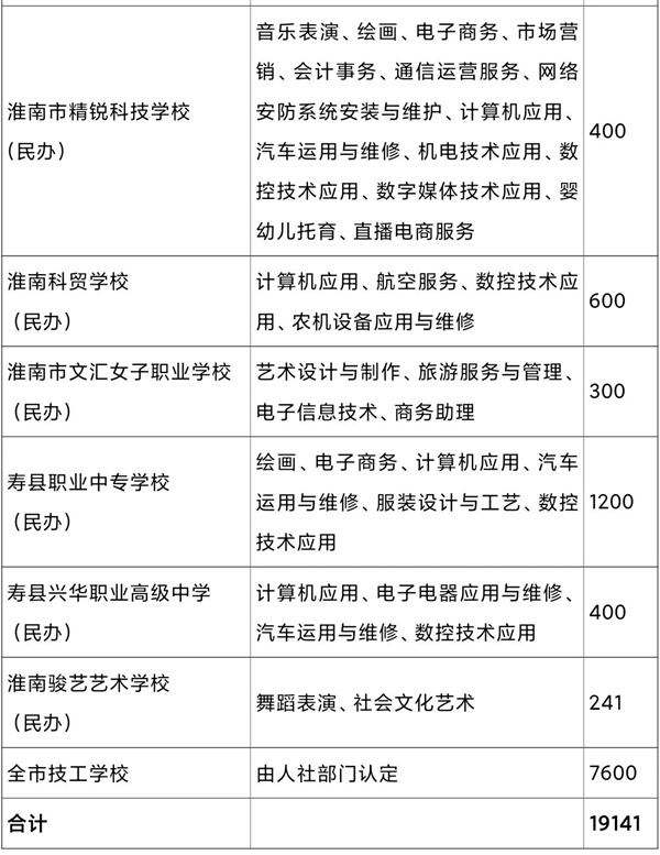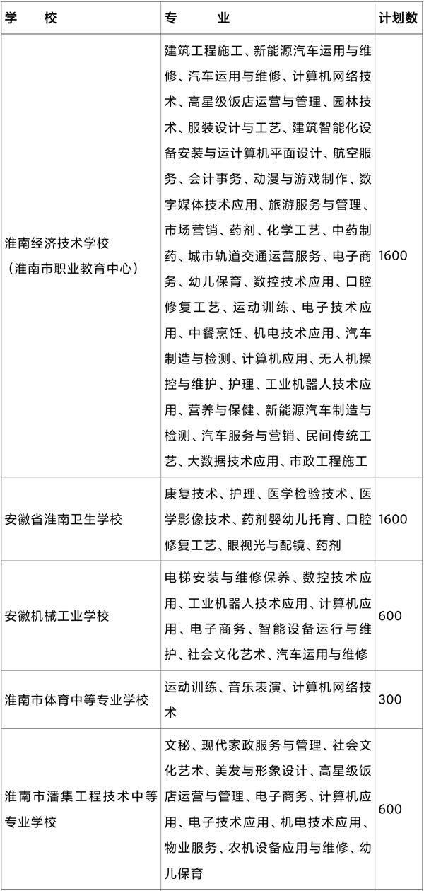 關(guān)于印發(fā)2023年淮南市中等職業(yè)學(xué)校指導性招生計劃的通知各縣區教育主管部門(mén),各中等職業(yè)學(xué)校:按照省教育廳有關(guān)文件要求,2023年我市中等職業(yè)學(xué)校計劃招生19141人 (含非全日制)?,F將我市職業(yè)學(xué)校指導性招生計劃下達給你們,并就有關(guān)事項通知如下:一、今年我市中職學(xué)校招生根據市教育體育局公布的2023年具備中等職業(yè)學(xué)歷教育招生資格的專(zhuān)業(yè)名單確定招生專(zhuān)業(yè)。二、鼓勵中等職業(yè)學(xué)校多方組織生源,擴大招生規模