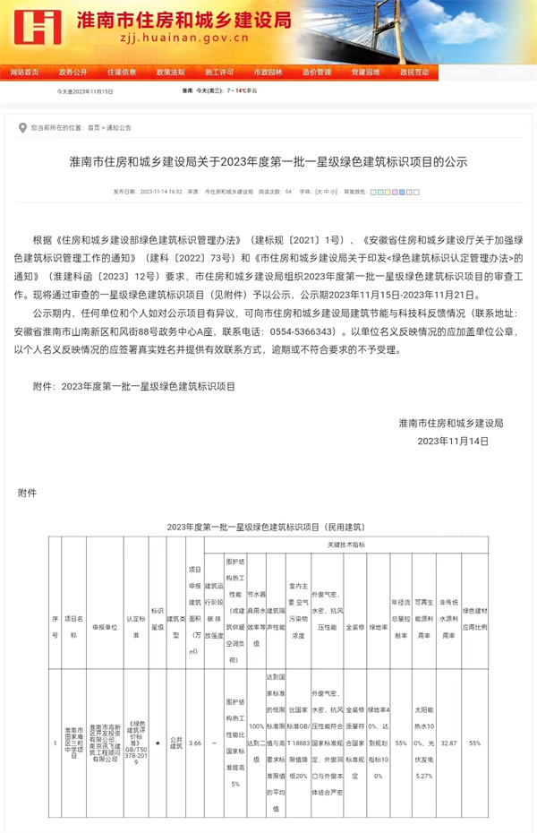 淮南市住房和城鄉建設局關(guān)于2023年度第一批一星級綠色建筑標識項目的公示