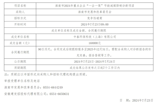 淮南市2024年重點(diǎn)企業(yè)“一企一策”節能減煤降碳診斷項目成交結果公示