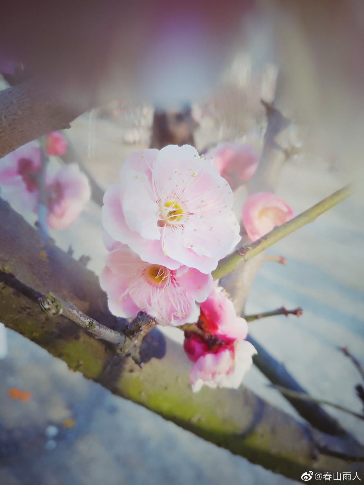 梅花(學(xué)名:Armeniaca mume Sieb.):小喬木,稀灌木,高4-10米;樹(shù)皮淺灰色或帶綠色,平滑;小枝綠色,光滑無(wú)毛。葉片卵形或橢圓形,葉邊常具小銳鋸齒,灰綠色?;▎紊蛴袝r(shí)2朵同生于1芽?jì)?,直?-2.5厘米,香味濃,先于葉開(kāi)放;花萼通常紅褐色,但有些品種的花萼為綠色或綠紫色;花瓣倒卵形,白色至粉紅色。果實(shí)近球形,直徑2-3厘米,黃色或綠白色,被柔毛,味酸;果肉與核粘貼;核橢圓形,