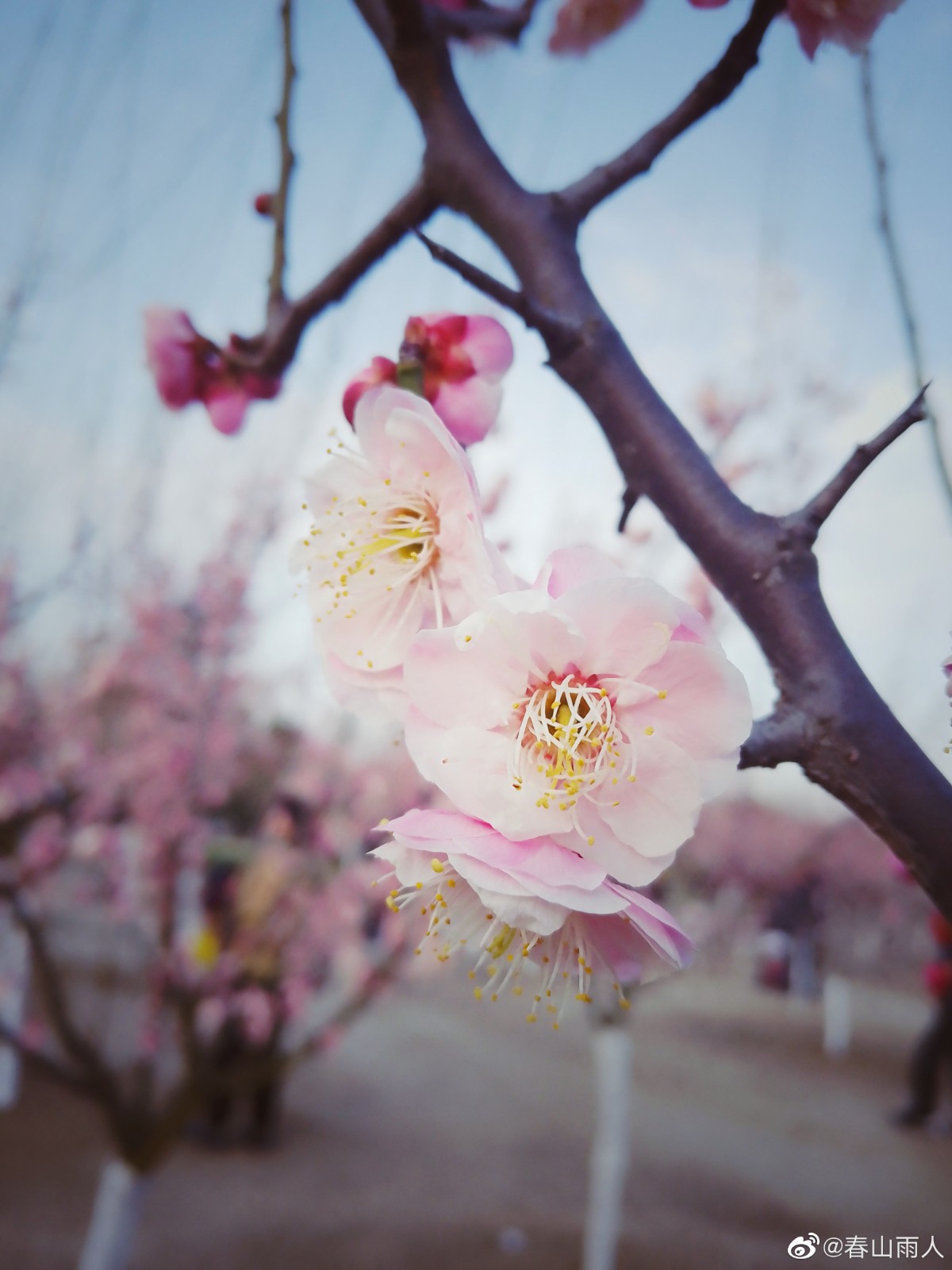梅花(學(xué)名:Armeniaca mume Sieb.):小喬木,稀灌木,高4-10米;樹(shù)皮淺灰色或帶綠色,平滑;小枝綠色,光滑無(wú)毛。葉片卵形或橢圓形,葉邊常具小銳鋸齒,灰綠色?;▎紊蛴袝r(shí)2朵同生于1芽?jì)?,直?-2.5厘米,香味濃,先于葉開(kāi)放;花萼通常紅褐色,但有些品種的花萼為綠色或綠紫色;花瓣倒卵形,白色至粉紅色。果實(shí)近球形,直徑2-3厘米,黃色或綠白色,被柔毛,味酸;果肉與核粘貼;核橢圓形,兩側微扁?;ㄆ诙杭?,果期5-6月。