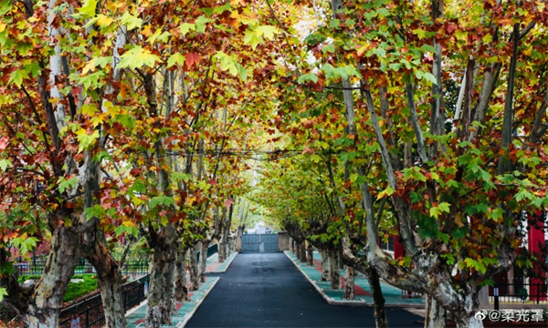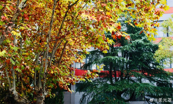 秋露還是一罐顏料。我們走在長(cháng)長(cháng)的石子路上,又來(lái)到了雪松旁。雪松還是那么綠,還像以前那樣,昂首挺胸,精神抖擻,碧綠如春。